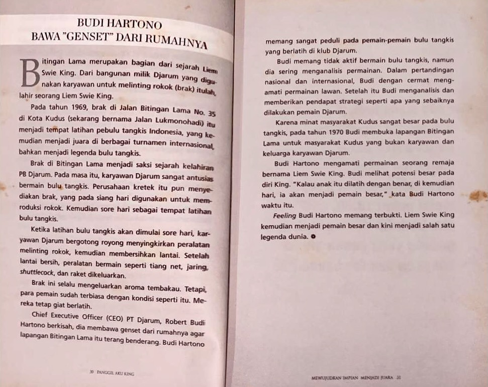 Pada 2009, buku pertamaku “Panggil Aku King”, biografi Liem Swie King (salah satu pebulu tangkis legendaris Indonesia) diterbitkan Penerbit Buku Kompas. Selain mewancarai King dan beberapa narasumber lainnya, aku berkesempatan mewawancarai Pak Robert Budi Hartono (pendiri dan pemilik PB Djarum) di kantornya di kawasan Petamburan, Jakarta Pusat — yang menurutku relatif sederhana untuk ukuran orang terkaya di negeri ini. Mengenakan kemeja putih, Pak Budi mempersilakan aku dan King masuk ke ruang kerjanya.