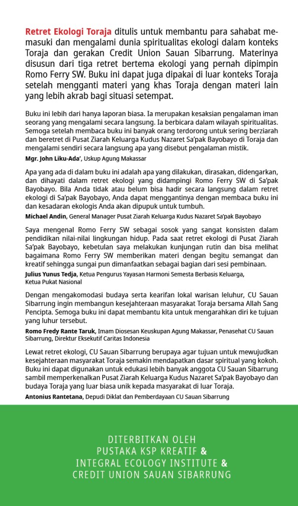 Retret Ekologi Toraja ditulis untuk membantu para sahabat memasuki dan mengalami dunia spiritualitas ekologi dalam konteks Toraja dan gerakan Credit Union Sauan Sibarrung. Materinya disusun berdasarkan latar belakang, bahan, dan pengalaman dalam tiga retret bertema ekologi tahun 2018, 2022, dan 2023, dengan beberapa penambahan artikel untuk memperkaya bahan retret ekologi.