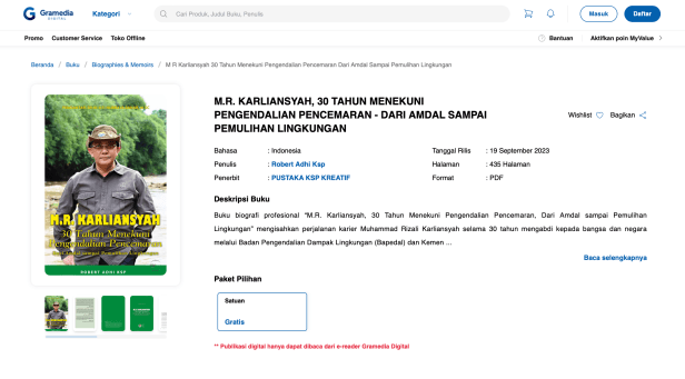 Kedua, buku biografi profesional “M.R. Karliansyah, 30 Tahun Menekuni Pengendalian Pencemaran. – Dari Amdal sampai Pemulihan Lingkungan” ,Robert Adhi Ksp, (gratis), tersedia di Gramedia Digital dan Google Books.