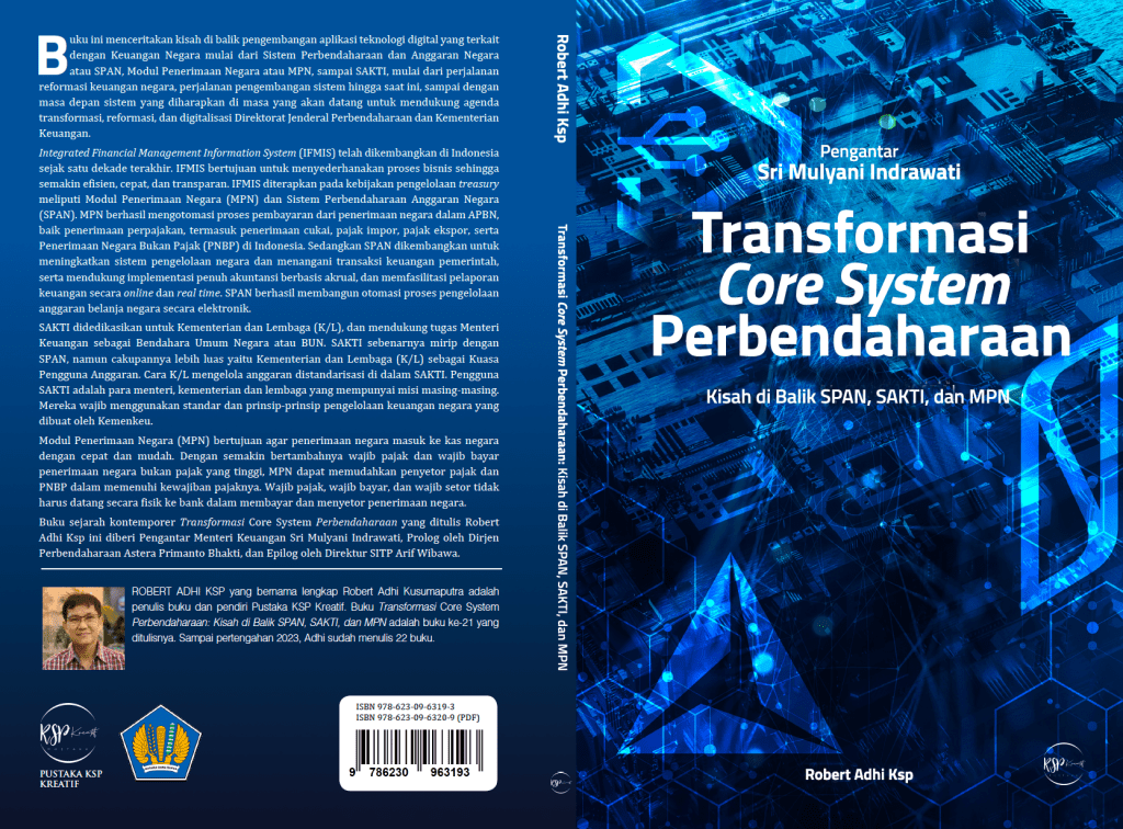 Buku sejarah kontemporer transformasi ‘core system’ perbendaharaan yang ditulis Robert Adhi Ksp ini diberi Pengantar Menteri Keuangan Sri Mulyani Indrawati, Prolog oleh Dirjen Perbendaharaan Astera Primanto Bhakti, dan Epilog Arif Wibawa.