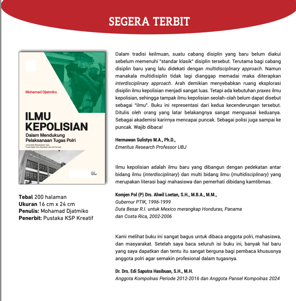 Kami melihat buku ini sangat bagus untuk dibaca anggota polri, mahasiswa, dan masyarakat. Setelah saya baca seluruh isi buku ini, banyak hal baru yang saya dapatkan dan tentu itu sangat berguna bagi pembaca khususnya anggota polri agar semakin profesional dalam tugasnya.