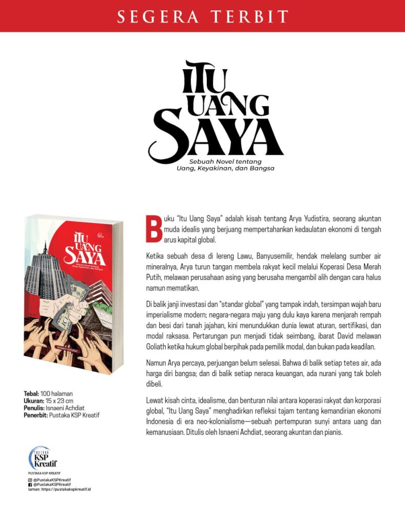 Lewat kisah cinta, idealisme, dan benturan nilai antara koperasi rakyat dan korporasi global, “Itu Uang Saya” menghadirkan refleksi tajam tentang kemandirian ekonomi Indonesia di era neo-kolonialisme—sebuah pertempuran sunyi antara uang dan kemanusiaan. Ditulis oleh Isnaeni Achdiat, seorang akuntan dan pianis.